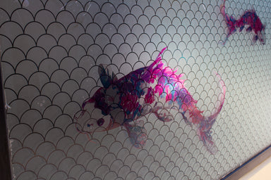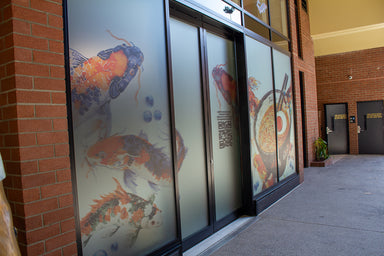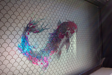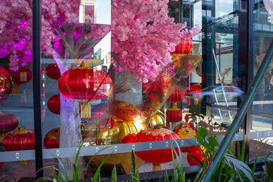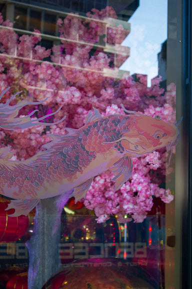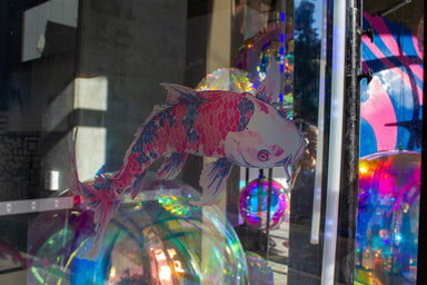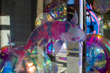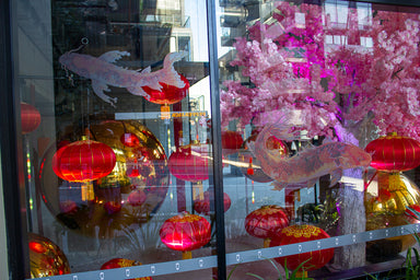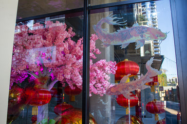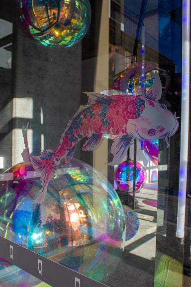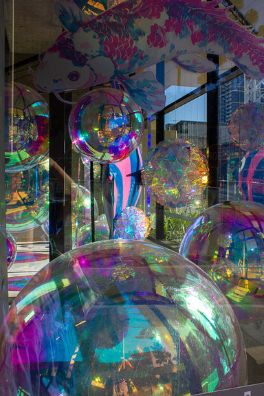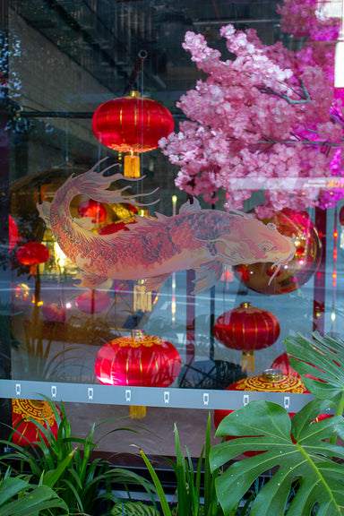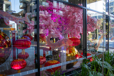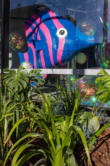 The 4 central tenancies were covered in stylised eye-catching nautical decals completely designed in-house here at TPH. The 2 corner tenancies featured contrasting window displays. Cordelia St showcased our magnificent Cherry Blossom tree, surrounded by lanterns, light tubes and gold inflatable balls. Merivale St featured our large tropical fish, surrounded by iridescent inflatable balls acting as bubbles, combined with acrylic shards and light tubes.