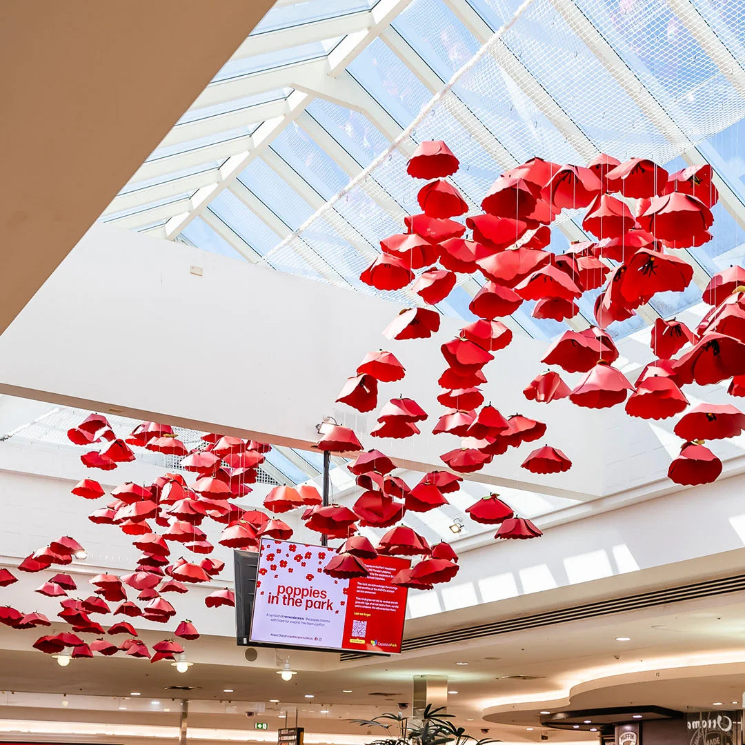 Partnering with a local primary school students who made the poppies, the main entry and Food Court voids featured 350 paper flowers cascading down from the ceiling. The Prop House Collective were integral in making the idea of Poppies in the Park a reality. With some tricky logistics involved, we needed to figure out how to make the concept actually doable! Their team were brilliant in conceptualising a design that gave the poppies an undulating, wave-like appearance, whilst covering a wide area. This dramatic saturation of colour and organic movement was exactly what we were looking for. Beyond this, their operations team went the extra mile to make sure every individual poppy was securely fastened, repairing any failures along the way.