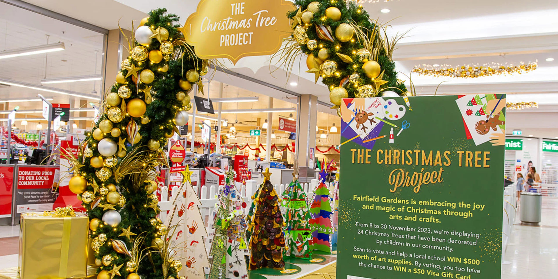 The Christmas tree project display in Fairfield Gardens radiates pure joy and creativity, showcasing a forest of colorful, handcrafted ornaments and whimsical decorations that sparkle with youthful enthusiasm and imagination.