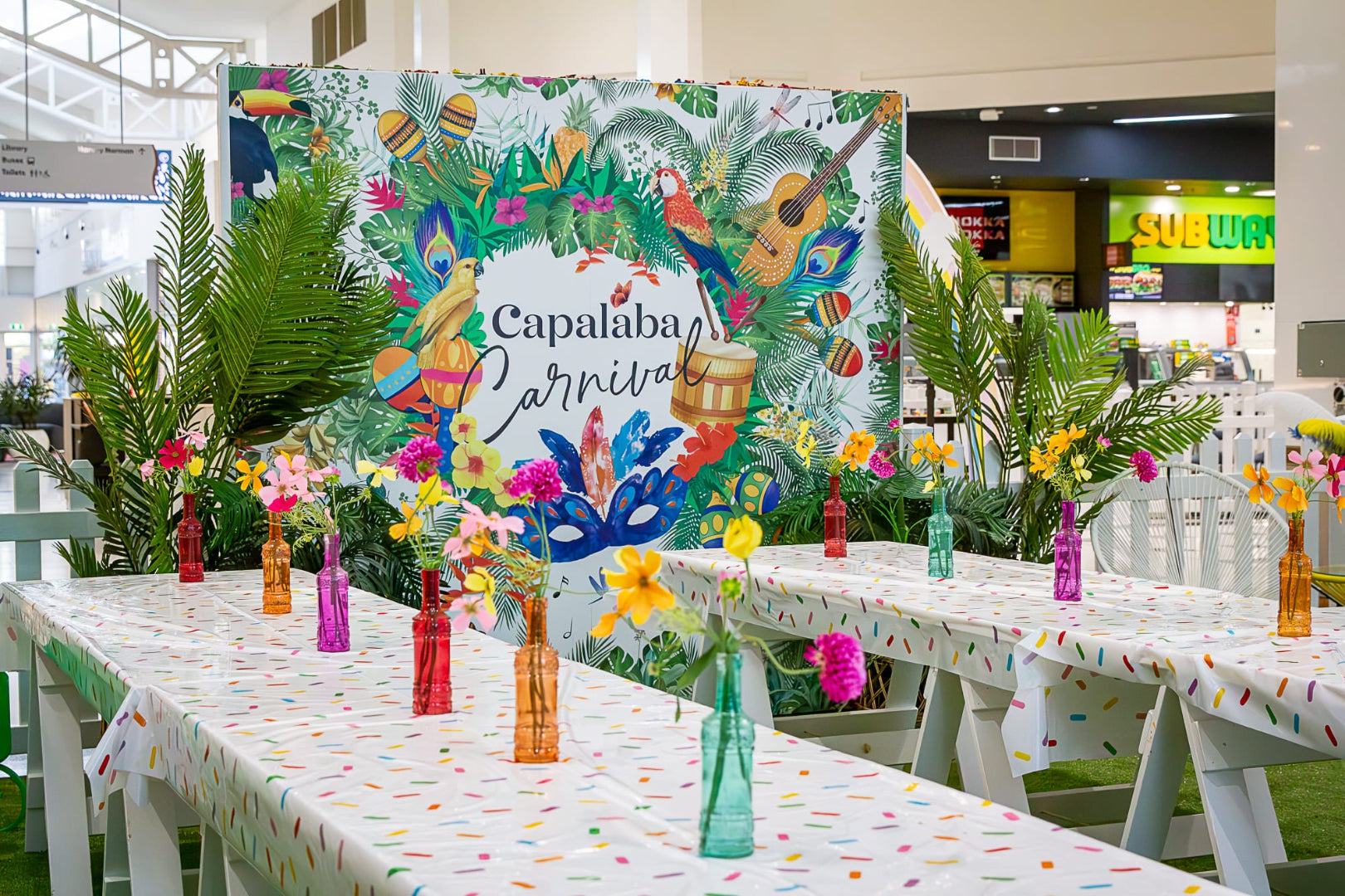 The space featured vibrant interactive props, framed by lush green turf. The statement entrance and photo moment backdrop both accentuated the main feature pieces; oversized neon birdcages.