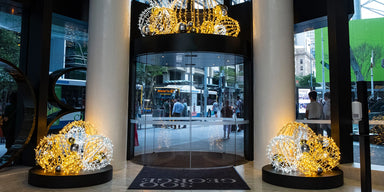 Stunning oversized gold baubles floating overhead create an ethereal Christmas experience at 300 George Street.