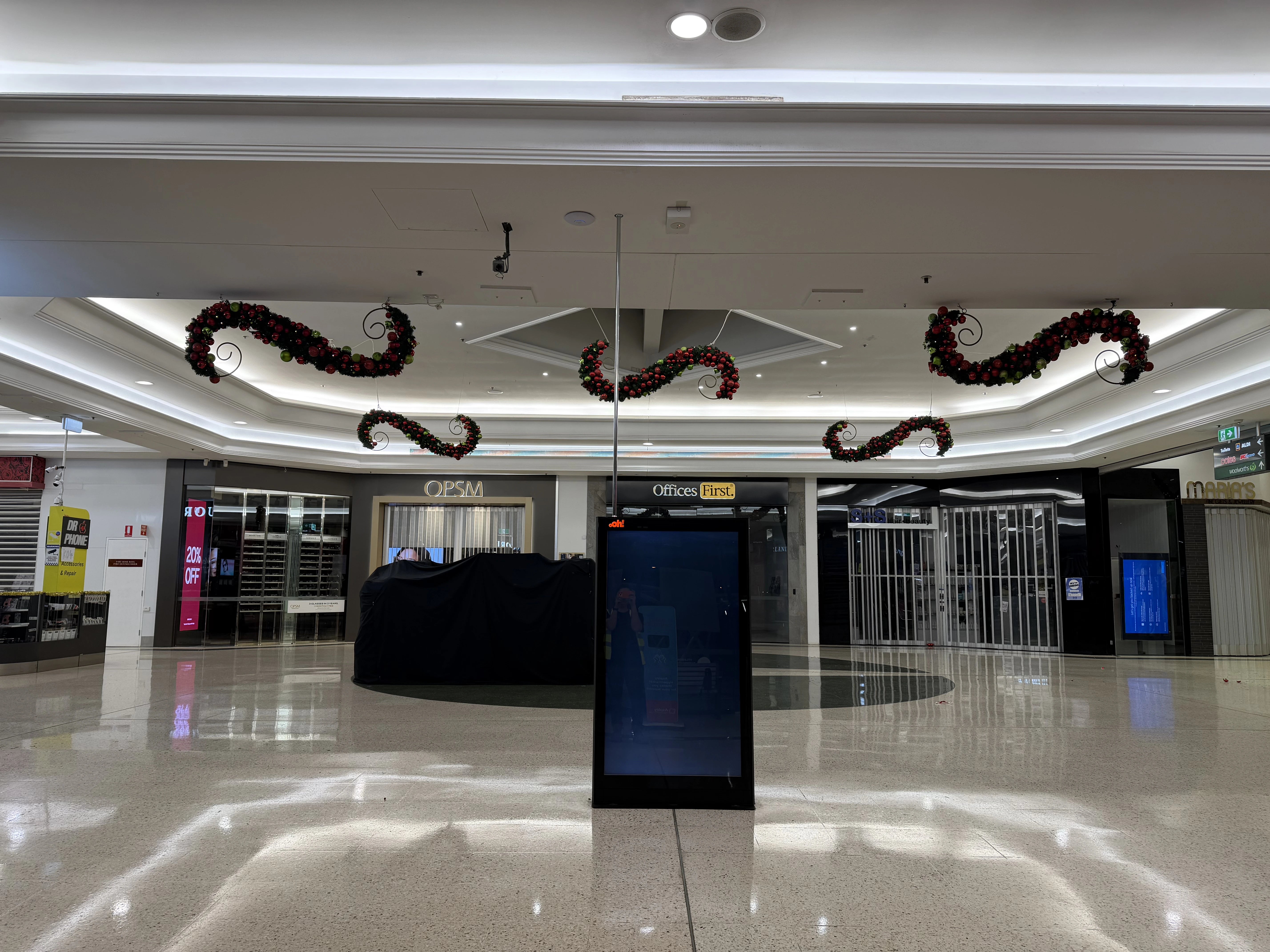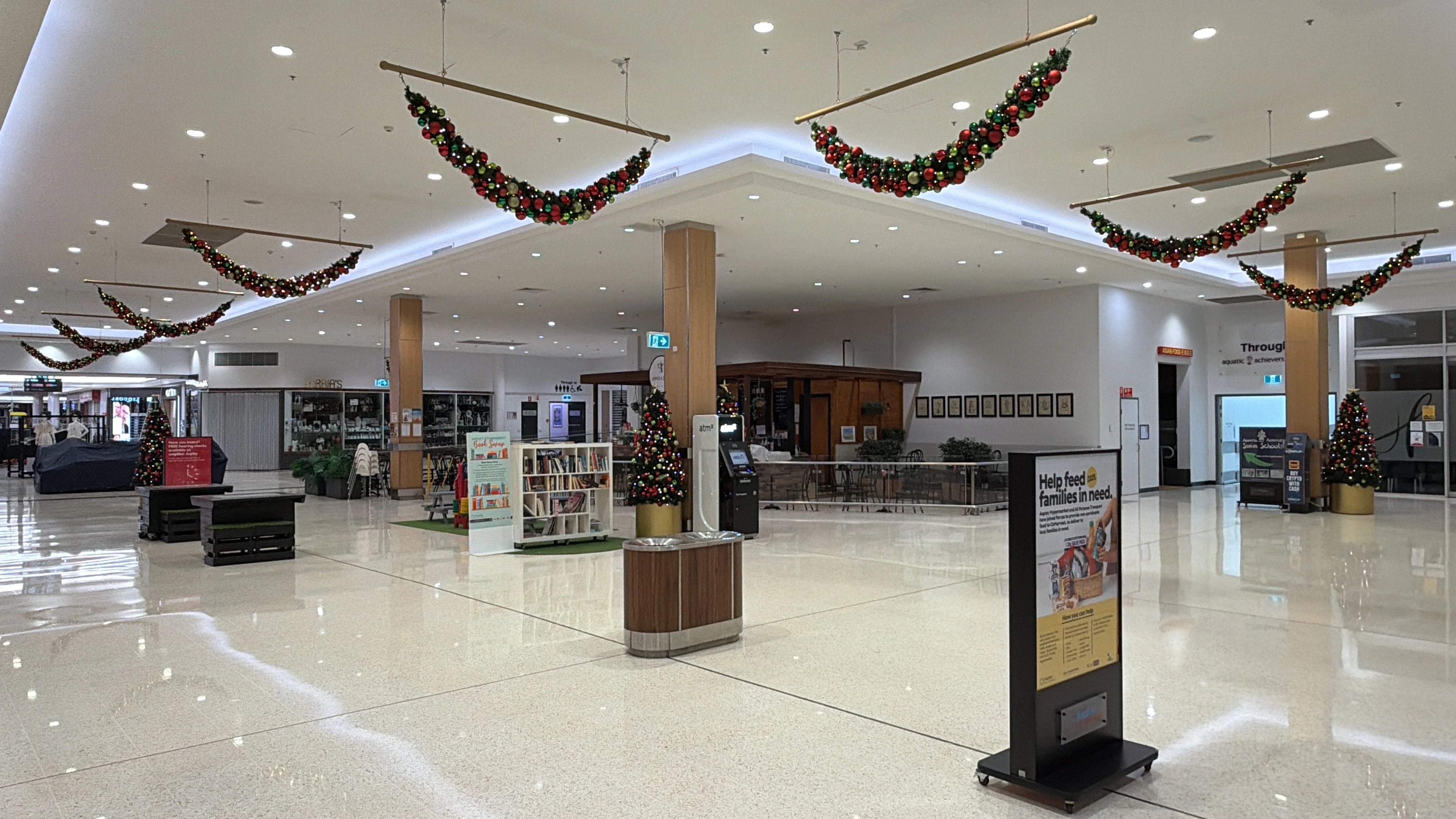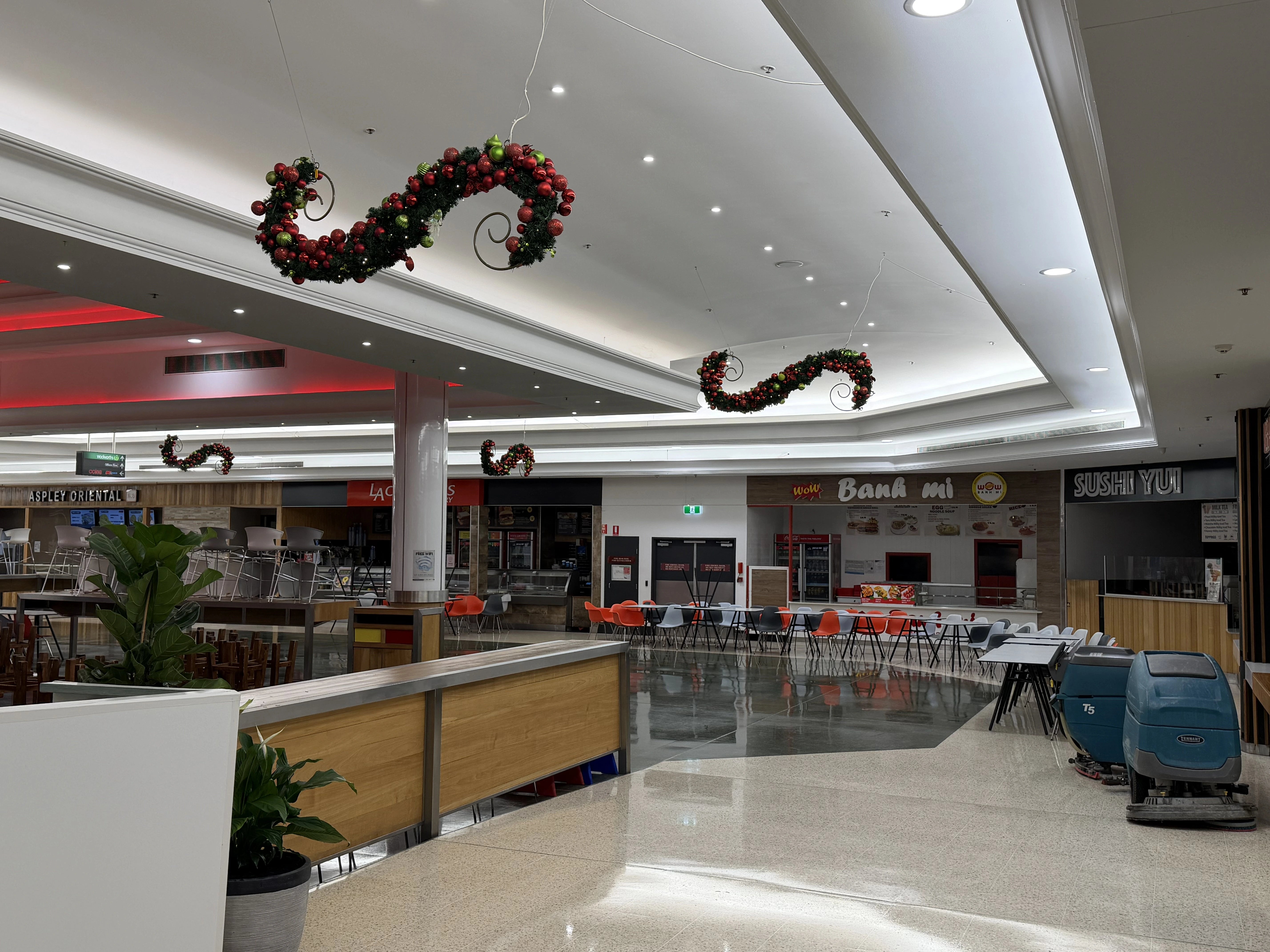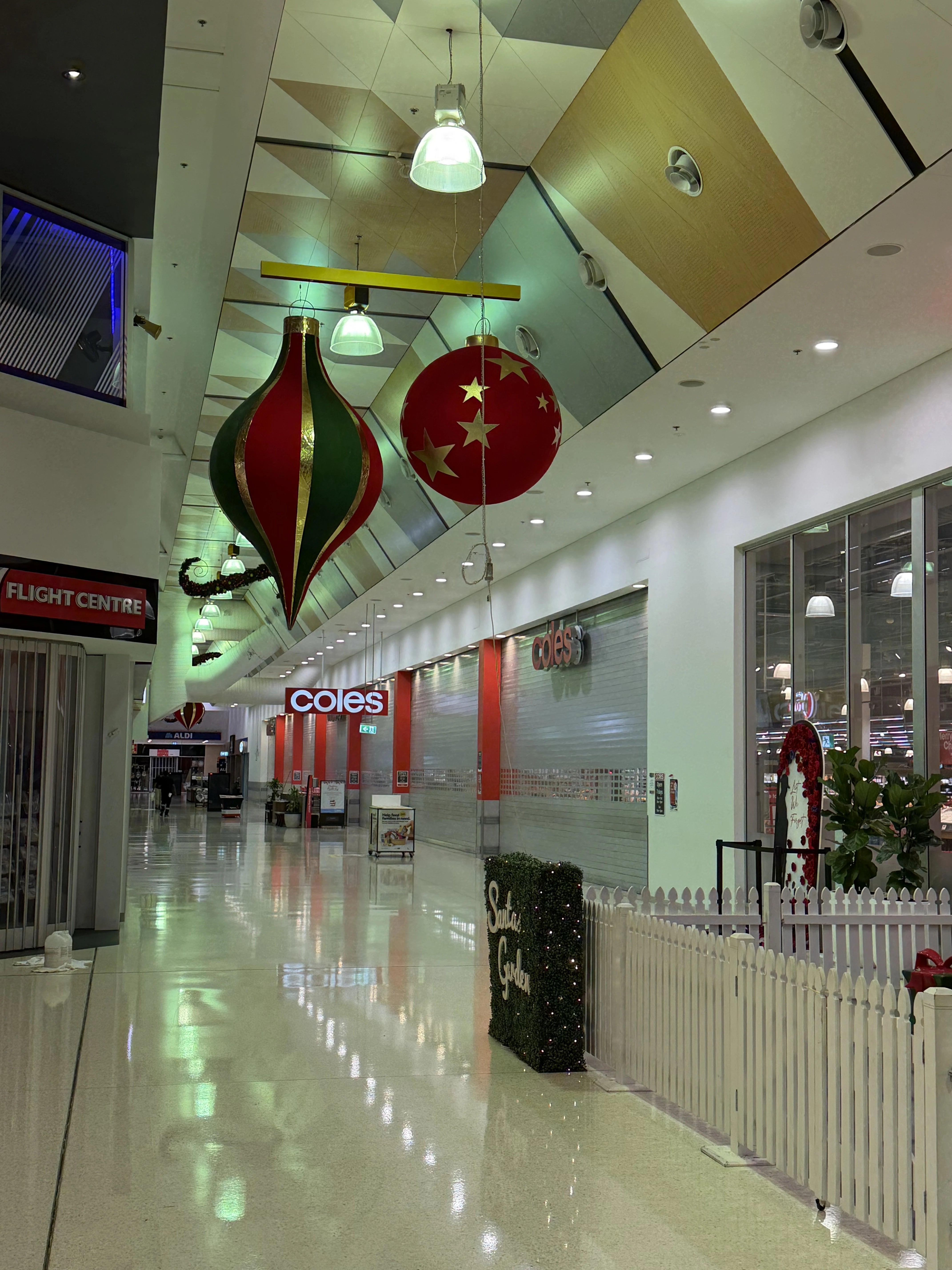 A large-scale Christmas installation was delivered throughout the centre, using suspended garlands, oversized ornaments and feature trees to create strong festive impact across key circulation spaces.