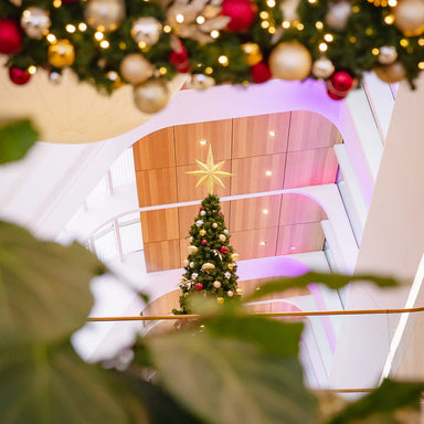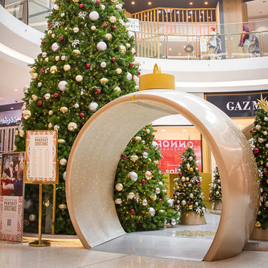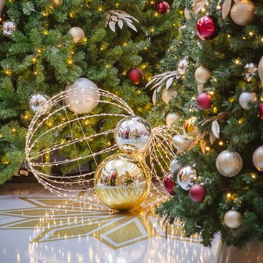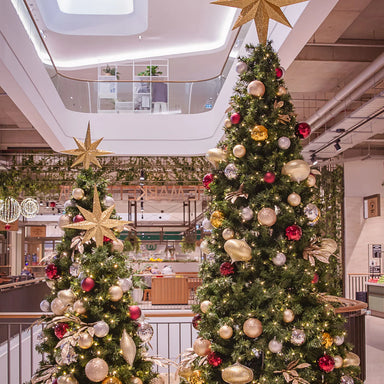 Traditional elegance takes center stage with ornate wreaths, rich red ribbons, and twinkling fairy lights, creating a heartwarming ambiance that captures the essence of a timeless holiday season.